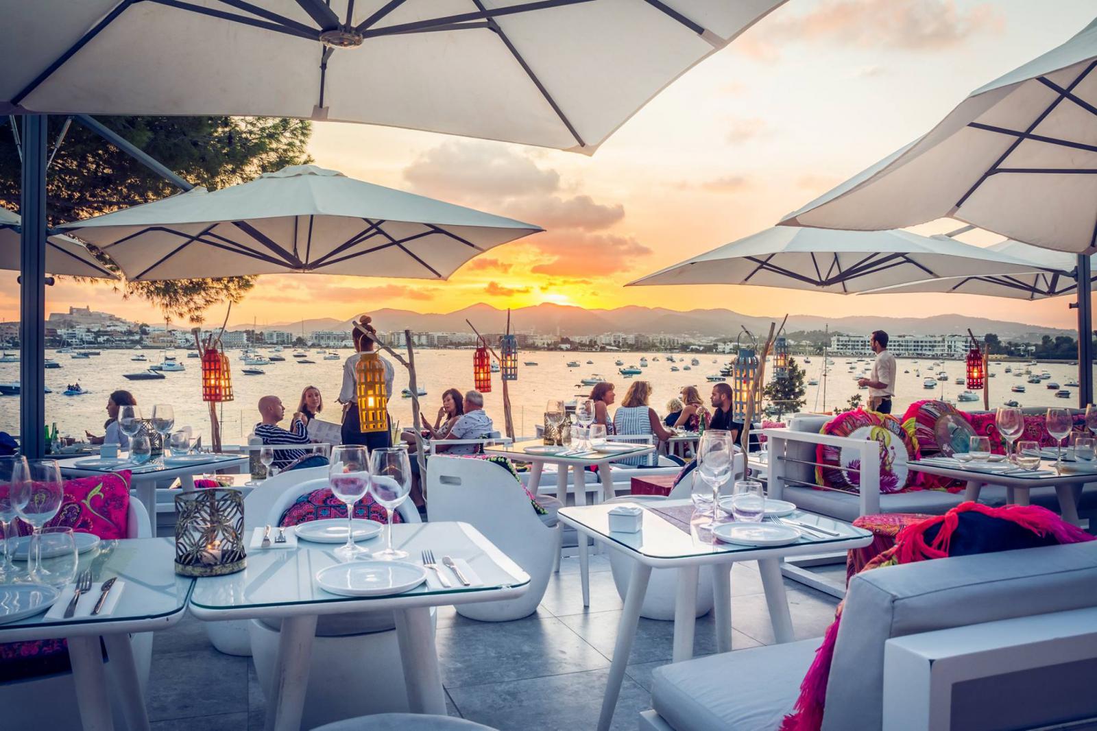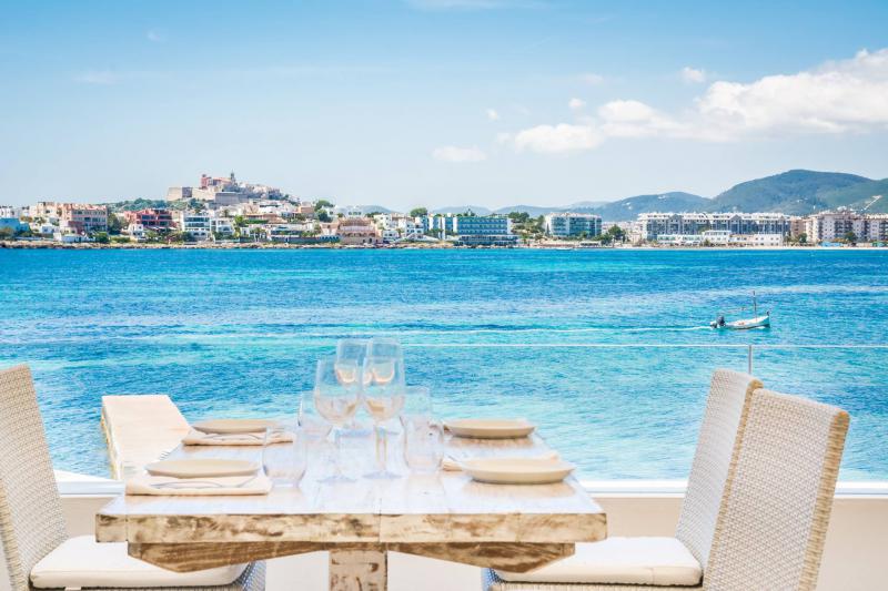 Le décor d'une élégance impeccable s'harmonise parfaitement avec l'emplacement saisissant - des eaux cristallines et étincelantes bordent doucement le rivage rocheux, avec des vues spectaculaires sur le site du patrimoine mondial de l'UNESCO Dalt Vila, la vieille ville d'Ibiza.