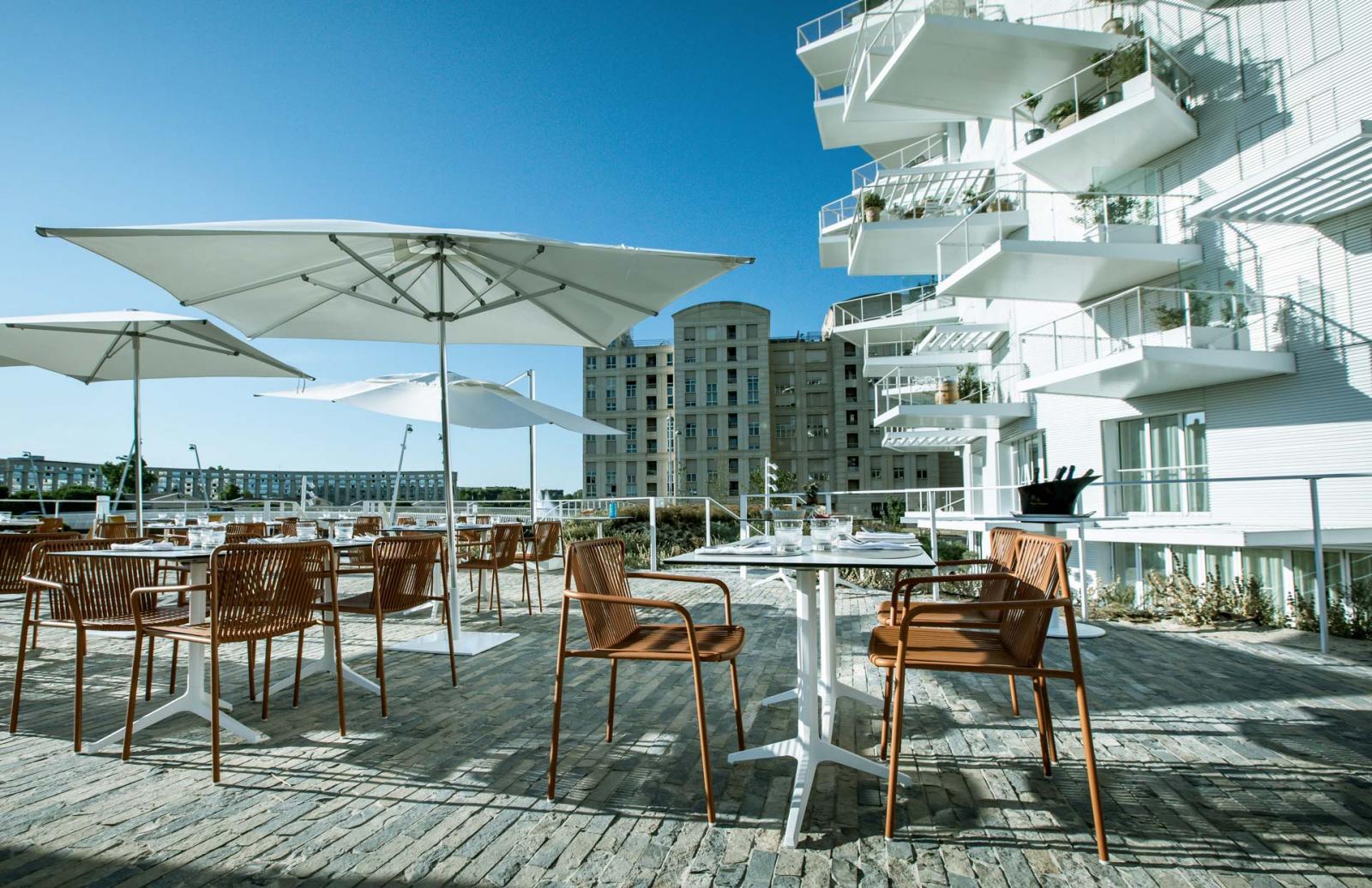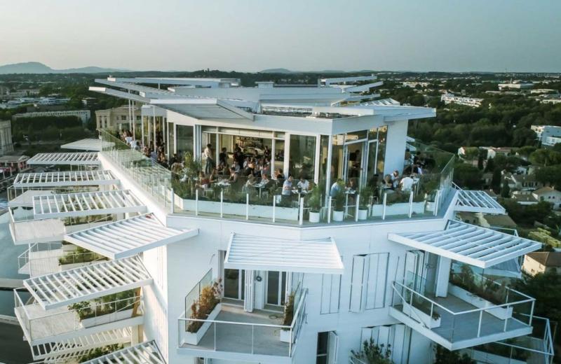 Un restaurant au pied de l'Arbre Blanc, folie architecturale de Montpellier, avec vue à 360°.