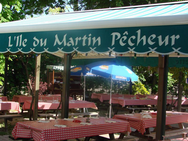 La guinguette est bien là, nichée sur l'Ile du Martin-pêcheur, presque secrète dans son écrin de verdure