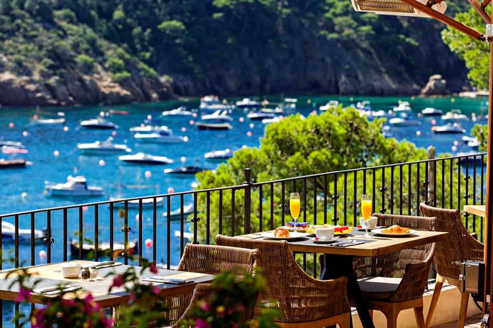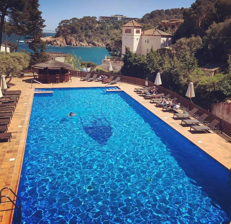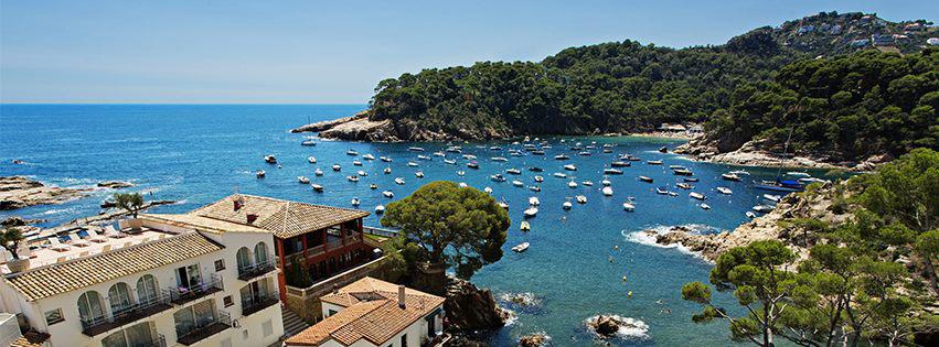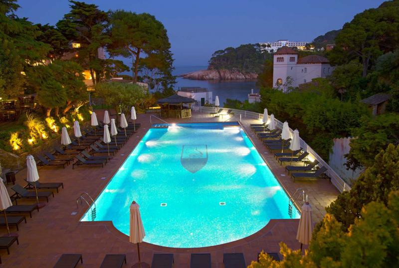 L'Hotel Aigua Blava, situé dans la baie d'Aiguablava à Begur, Costra Brava, entourés de criques, roches et de pins.