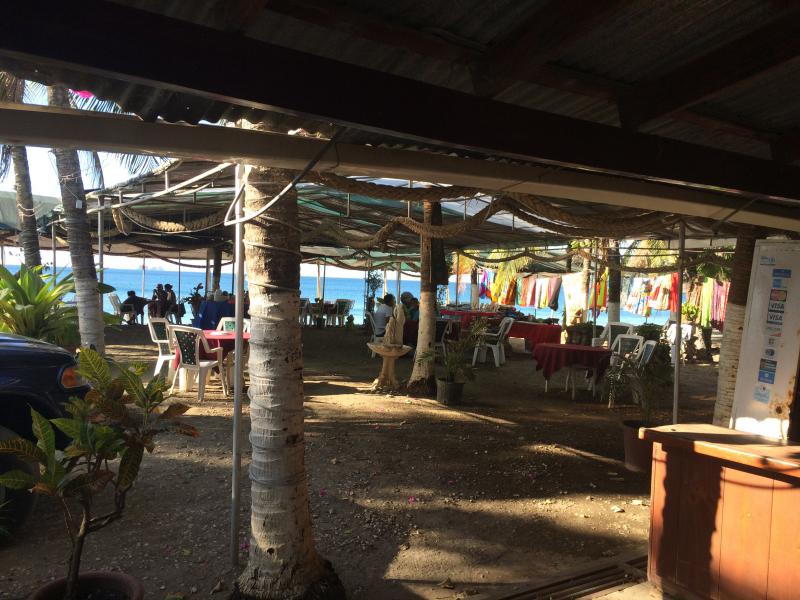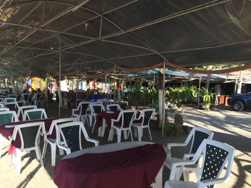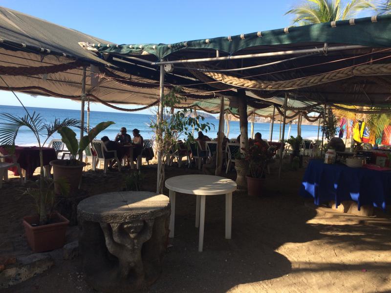 Restaurant de fruits de mer les pieds dans le sable.