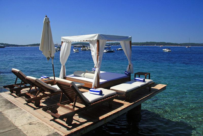 Bonj est comme une oasis – avec sa colonnade de pierre blanche des années 30, elle est située face à la mer cristalline et limpide de la baie de l'Amfora, sous les pins odorants et vue sur les iles Pakleni.