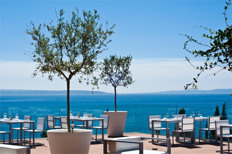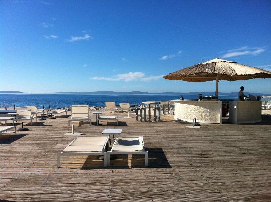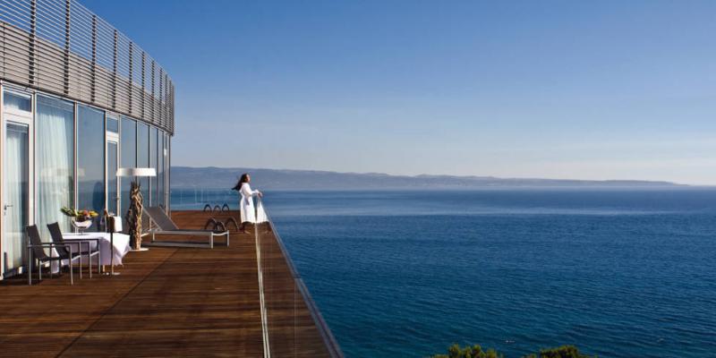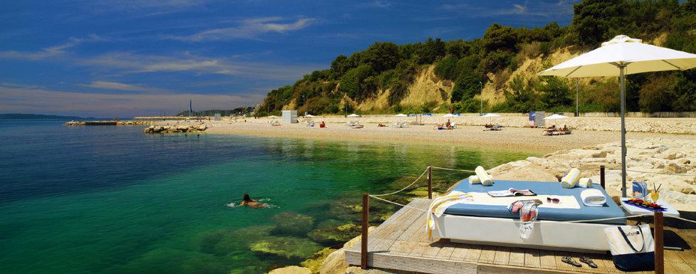 Surplombant les eaux turquoises de la mer Adriatique sur une terrasse en bois de 1100 m2 avec un accès direct à la plage privée.