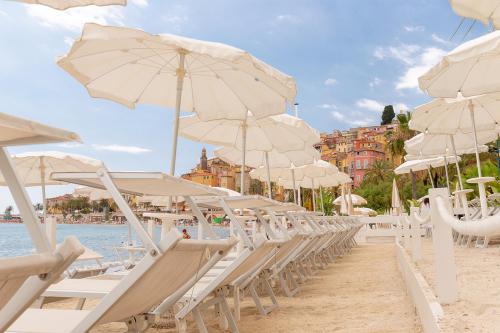 Venez profiter d'une journée de relaxation sur cette plage privée au décor blanc : du transat aux tables, en passant par les voilages. Idéal pour vous détendre et profiter du soleil et du calme que Menton a à offrir.