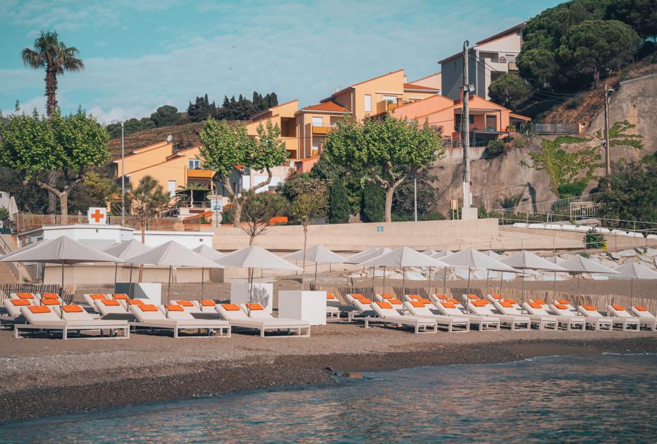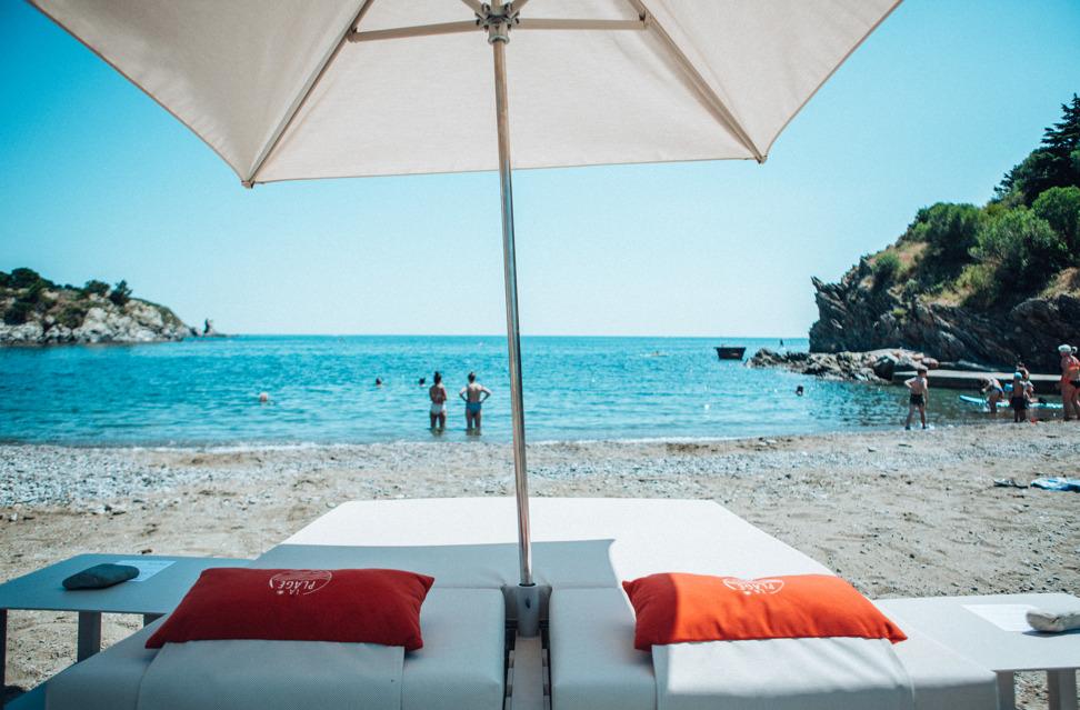 Quelques transats blancs, une paillote en bois naturel, de petits arbres qui rappellent la garrigue et la mer est à vos pieds…