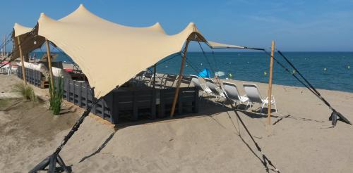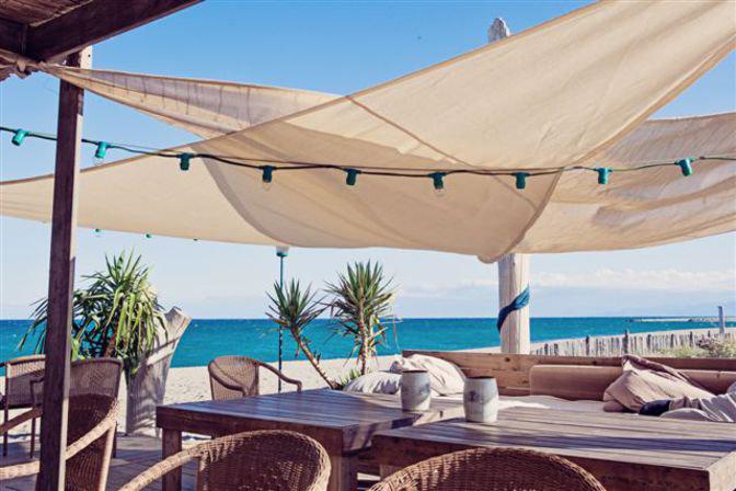 paillote située à Toreilles dans les Pyrénées Orientales. Le cadre est idéal avec un balcon sur la mer, où bois exotique et bois flotté cohabitent harmonieusement.