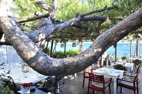 Une petite maison blanche posée devant la mer, des tables presque les pieds dans le sable offre une vue imprenable sur les îles d'Or. Venez dégusterez une cuisine raffinée méditerranéenne composée essentiellement de poissons, et apprécierez l’ambiance zen de ce paradis sauvage