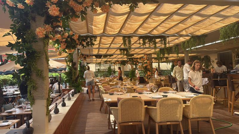 COYA Beach, les journées sont passées pieds nus, dans un bonheur total—des transats signature et des lits doubles sont dispersés sur les sables dorés de Pampelonne, caressés par la mer turquoise.