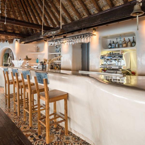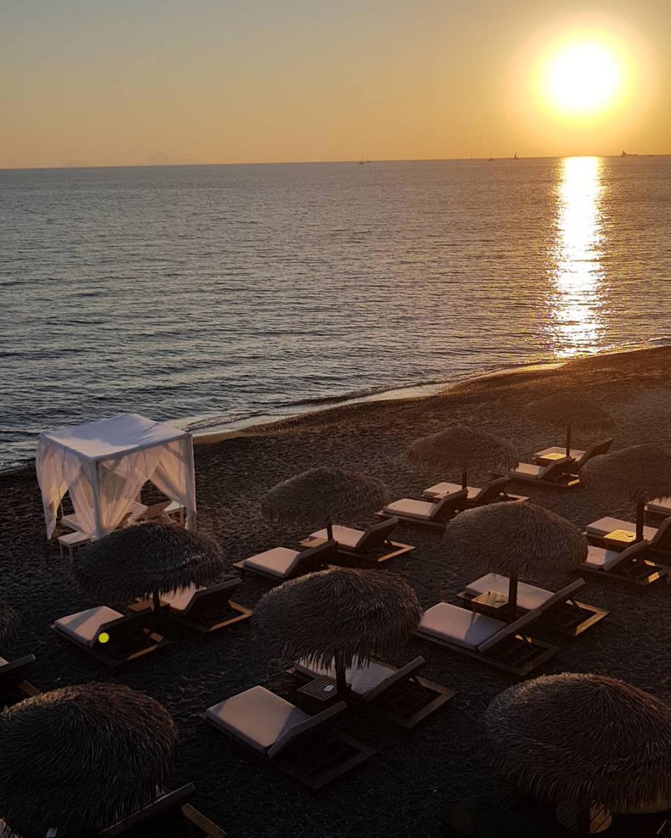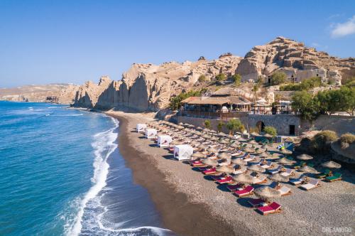 Dans un paysage d'une beauté extraordinaire, à la plage d'Eros sur l'île de Santorin, Theros Wave Bar est la destination idéale pour toute la journée pendant l'été.