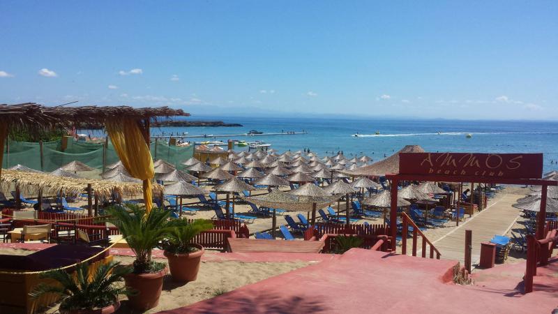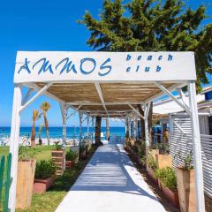 Ammos Beach Club est unique par son emplacement sur la plage d'Agios Nikolas (Saint Nikolas) à Zakinthos, en Grèce, avec de l'eau de mer bleu profond. Au bout de la plage se dresse la petite et pittoresque église d'Agios Nikolas. L'accès est très facile par la route principale de Vasilikos. De plus, il y a beaucoup d'espace pour garer son véhicule.