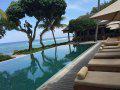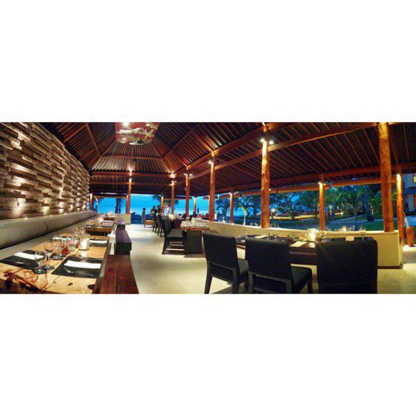 Avec le Mont Gunung Agung de Bali à l'horizon, le restaurant et les transats sont l'endroit idéal pour