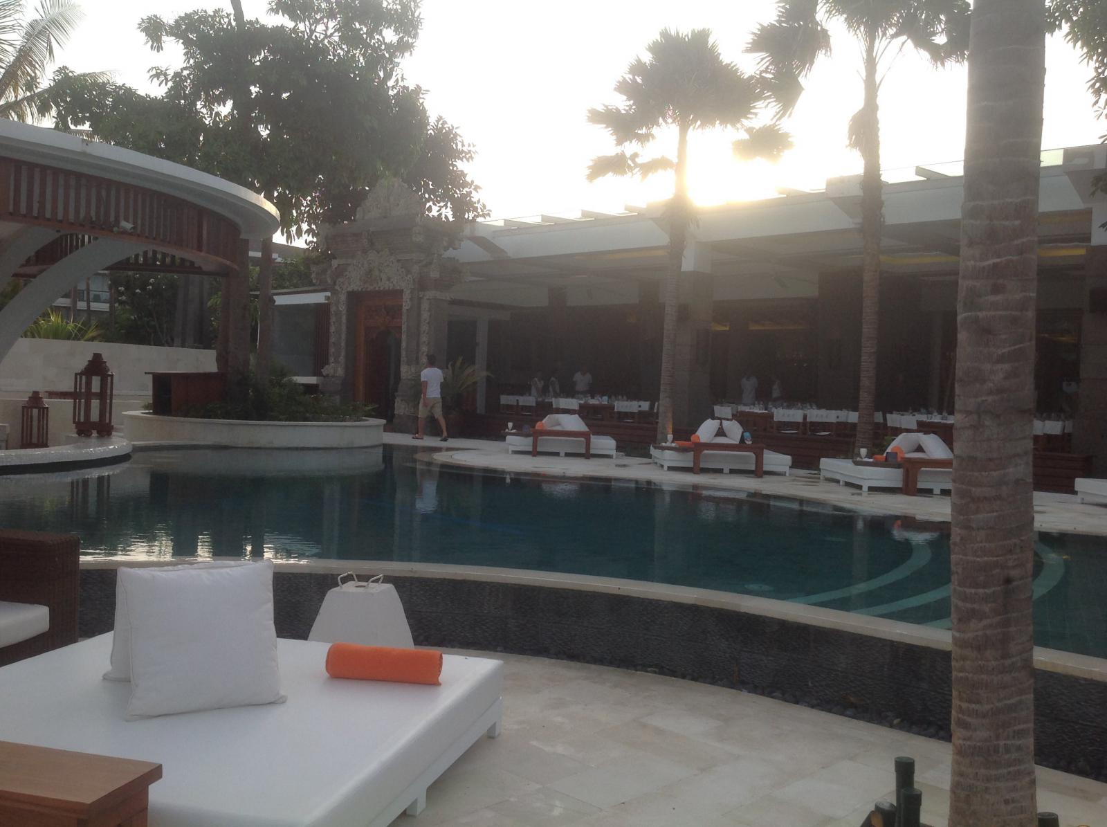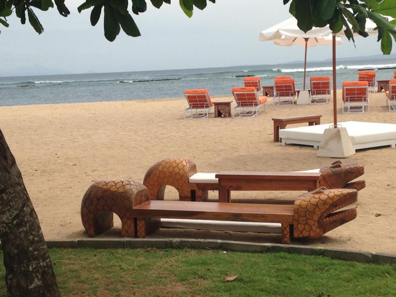 Devant l'hôtel Sofitel à Nusa Dua, toujours les notes naturelles et orange du Groupe, mais avec une touche balinaise, personnel à votre écoute, l'ambiance des soirées des vendredis est exceptionnelle (musique, mode, cinéma)