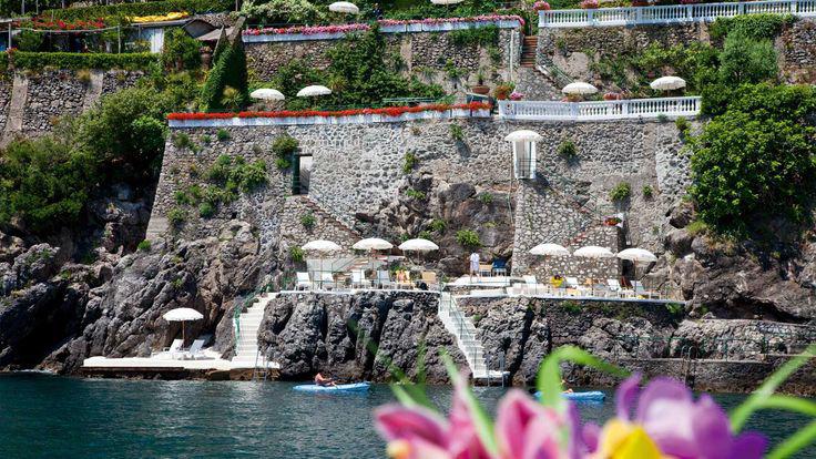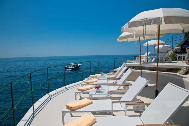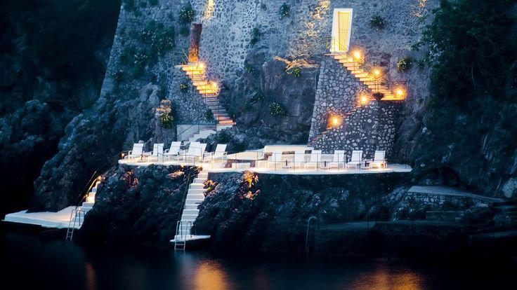 Multiples terrasses et petite piscine perchées le long du rivage rocheux de la côte Amalfitaine. L'accès à la mer se fait